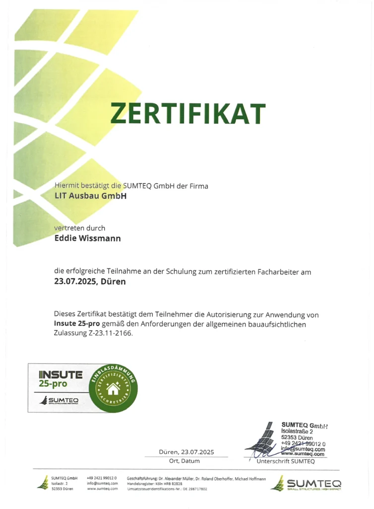 AUSGEZEICHNET Basierend auf 39 Bewertungen Fares GetzinTrustindex überprüft, ob die Originalquelle der Bewertung Google ist. Ich habe den Dachstuhl meines MFH mit einer Einblasdämmung versehen lassen. Die Arbeiten wurden zügig wie vereinbart durchgeführt. Herr Lichtenberg und sein Team waren sehr kompetent und freundlich! Rick CzajaTrustindex überprüft, ob die Originalquelle der Bewertung Google ist. Wir haben gerade ein Bungalow mit Satteldach ohne Dachboden kernsaniert. Nachdem wir fertig waren und der Innenausbau schon weit vorangeschritten war, zerstörte ein Marder eine beträchtliche Fläche der neu verbauten Holzfaserdämmung im Bereich zwischen den Sparren. Bauartbedingt war eine Reparatur nicht oder nur durch untragbar finanziellem Mehraufwand möglich. Die Dacheindeckung war erfolgt und wir wohnten bereits im Haus. Zugleich war die Fassadendämmung in vollem Gange. Auf der Suche nach einer Lösung kontaktierte ich mehrere Unternehmen, welche mir reihenweise und aus verschiedenen Gründen Absagen erteilten. Eines dieser Unternehmen jedoch verwies auf die Firma LIT-Ausbau. Ich rief daraufhin den Ansprechpartner Eddie Wissmann an und schilderte meine Problematik. Eddie hat sich von mir ein paar Bilder schicken lassen und sich mit einem kurzfristigen vor Ort Termin bei mir gemeldet. Nachdem feststand, dass das Einbringen der Einblasdämmung wirklich schwierig aber möglich ist (alles, bis auf den Flur, musste von außerhalb des Gebäudes erfolgen), wurde ich noch umfassend zu den verschiedenen Dämmmaterialen beraten, mit den dazugehörigen Datenblättern versorgt und ich bekam ein Angebot per Mail. Am Tag der Leistungserbringung kam das Unternehmen gut gelaunt und pünktlich bei mir an und ging nach kurzer Vorbesprechung ans Werk. Es handelte sich dabei um einen Samstag, welcher mir aufgrund meines Termindrucks durch andere Gewerke und dem vollen Terminkalender des Unternehmens von LIT angeboten wurde, da die Aussendämmung weitergehen sollte und das den Einblasbereich verschlossen hätte. Das ist heutzutage auch alles andere als selbstverständlich - aber dazu später mehr. Am Ende des Tages waren 100qm Zwischendecke gedämmt und an kritischen Stellen wurde für mich kostenneutral mehr Material eingebracht, weil man nicht nur den Auftrag erledigen, sondern auch ein perfektes Ergebnis erzielen wollte. Nach Abschluss jeder Einblassituation, wurden mir Fotos der erfolgten Dämmung gezeigt und sich nach meiner Zufriedenheit erkundigt. Von Erstkontakt bis Abschluss der Arbeiten vergingen 8 Tage. Leute, die ebenfalls gerade bauen oder sanieren, dürften einschätzen können, was das für eine unglaubliche Leistung ist. Darüberhinaus waren auch alle anderen Faktoren wie Kommunikation, Preis, Verlässlichkeit, Sauberkeit und natürlich das Ergebnis außerordentlich. Ich bin LIT-Ausbau unendlich dankbar, da sie diesen Schaden so vollumfänglich behoben und dabei durch die komplett lückenlose Dämmung ein noch besseres Resultat erzielt haben. Und das komplett ohne die im Handwerk leider oft anzutreffende Überheblichkeit und Arroganz. Nachbrenner: Da sich durch den Schaden und dessen Behebung durch die Einblasdämmung das Dach in ein Kaltdach änderte, musste eine Trochenbau-Innenwand nachträglich nach oben hin geschlossen werden, da der obere Teil außerhalb der neuen Dämmebene lag. Also habe ich wieder Eddie Wissmann kontaktiert, mich beraten lassen und das Unternehmen kam nach einem Termin in meiner Wohngegend kurzerhand vorbei und verfüllte die Innenwand ebenfalls von außen und zu einem unschlagbaren Preis. Hätte ich vorher über die Möglichkeiten der Einblasdämmung gewusst, dann hätte ich mir sehr viel Arbeit, Frust und Geld gespart und gleich alles von LIT machen lassen. Es geht - selbst in Eigenleistung - nicht besser, schneller oder sogar günstiger. Vielen, vielen Dank! Thomas von GizyckiTrustindex überprüft, ob die Originalquelle der Bewertung Google ist. Top Service und schnelle Reaktion auf Nachfragen. Hervorragendes Preis-Leistungsangebot. Crisu CrisuTrustindex überprüft, ob die Originalquelle der Bewertung Google ist. Hat alles super geklappt Frank KarliczekTrustindex überprüft, ob die Originalquelle der Bewertung Google ist. Zuverlässig, kompetent, professionell. Klare Weiterempfehlung! R. B. C. SeemannTrustindex überprüft, ob die Originalquelle der Bewertung Google ist. Wir sanieren gerade ein denkmalgeschütztes Haus aus den 30er Jahren. Da das Mauerwerk doppelwandig ist, die Fassade erhalten bleiben soll und eine Innendämmung viele Folgegearbeiten und verkleinerte Räume nach sich gezogen hätte, bot sich die Einblasdämmung als effektive und im Vergleich preiswerte Lösung an. Die Fa LIT Ausbau GmbH kann ich hierfür ohne irgendwelche Abzüge weiterempfehlen. Von der Angebotsstellung über die Ausführung der Einblasdämmung bis zur Rechnung war alles perfekt. Die Kommunikation war sehr gut, unsere Fragen wurden immer schnell und freundlich beantwortet. Es war auch die einzige von uns angeschriebene in dem Bereich tätige Firma, die nicht nur das LV ausgefüllt, sondern die Baustelle im Vorab auf Geeignetheit besichtigt hat. Vielen Dank! H. WiterTrustindex überprüft, ob die Originalquelle der Bewertung Google ist. Wir haben 2024 unser 30er Jahre Einfamilienhaus kernsaniert. In diesem Kontext haben wir uns dafür entschieden, das zweischalige Mauerwerk mit Einblasdämmung zu füllen um den Dämmwert der Gebäudehülle zu verbessern. Wir haben bei mehreren Berliner Firmen aus dem Bereich angefragt. Alle - außer LIT - haben abgewunken, da zweischaliges Mauerwerk für unser Baujahr und unsere Gegend unüblich sei. LIT hat dennoch angeboten, kurzfristig vorbeizukommen um Probebohrungen vorzunehmen. Und zu aller Überraschung hatten wir tatsächlich zweischaliges Mauerwerk. Herr Wissmann hat daraufhin das Vorgehen erläutert und ein Angebot geschrieben und wir haben zeitnah den Auftrag erteilt. Die Zusammenarbeit lief äußerst gut und wir hatten 